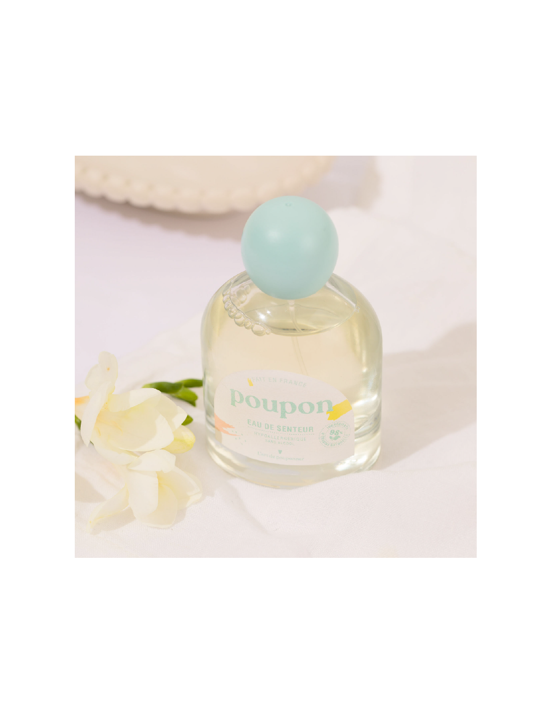El eau de parfum sin alcohol perfuma delicadamente a los niños pequeños con su dulce aroma de almizcle blanco y azahar.