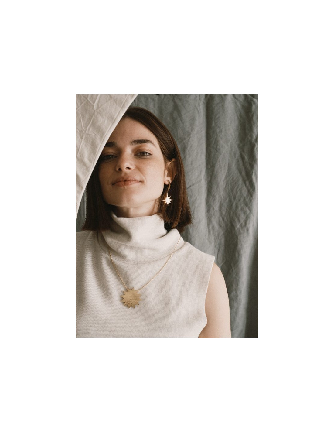 Verne es un gran sol acabado con textura y montado sobre una cadena de 55cm de largo. Collar fabricado en latón y chapado en oro de 18kt, libre de níquel y plomo.