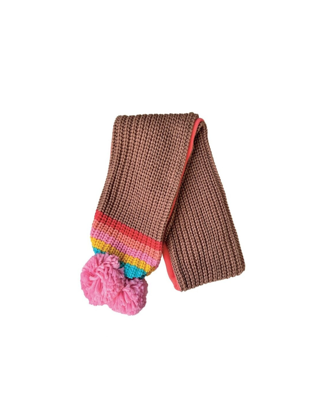 ¡Agrega un toque de color este invierno con nuestra divertida bufanda a rayas arcoíris! Diseñada con brillantes rayas de arcoíris y un pompón rosa brillante en cada extremo, esta bufanda también está completamente forrada con polar para mayor comodidad.