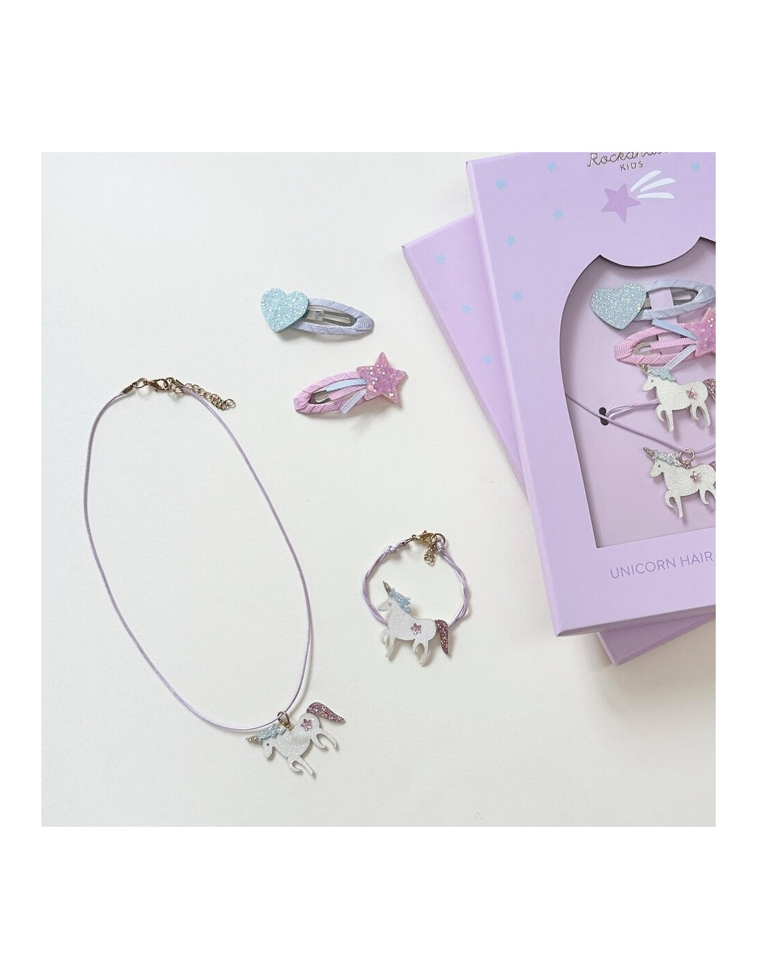 ¡Nuestra caja de regalo de joyas y pelo de unicornio es el regalo perfecto! Incluyendo dos clips para el cabello con una estrella fugaz y un corazón, y un collar y una pulsera de unicornio maravillosamente brillantes, cada juego está bellamente presentado en una caja de regalo que tiene el tamaño perfecto para regalar en un buzón. Creemos en los unicornios, ¿y tú?