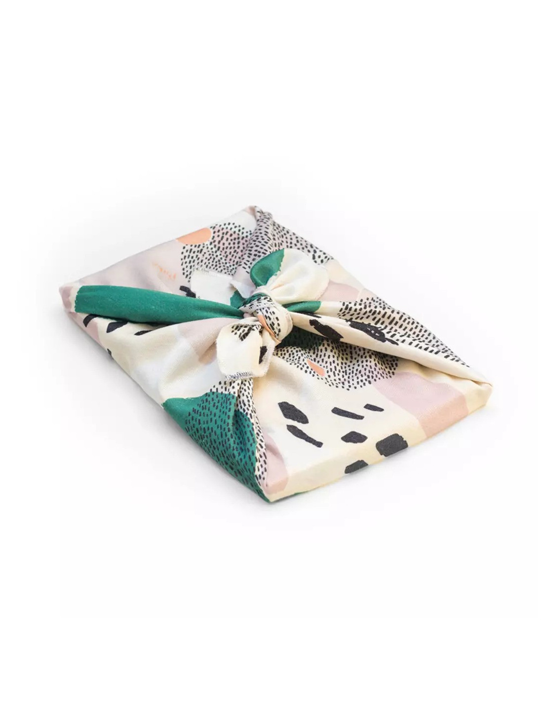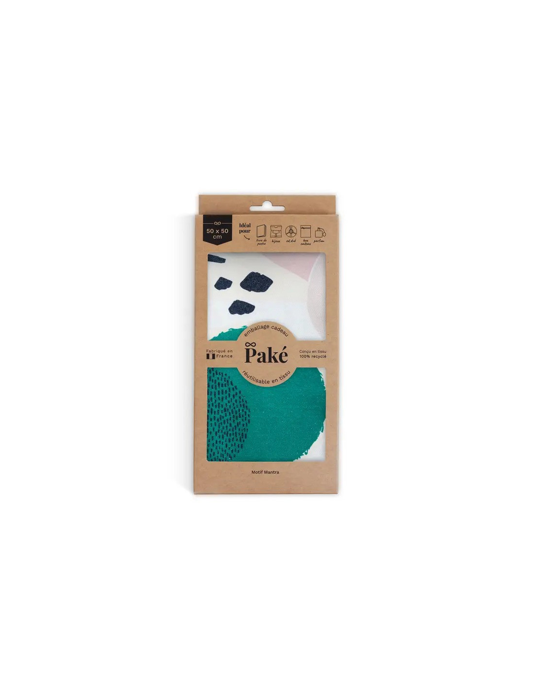 Embalaje de regalo reutilizable hecho de tela 100% reciclada. Patrón de mantra. Nuestros paké están tejidos, estampados y fabricados en Francia, a partir de fibras recicladas. Tamaño 50x50 cm ideal para empacar libros de bolsillo, joyeros o perfumes.