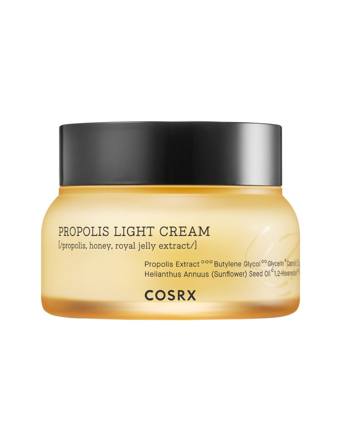 Full Fit Propolis Light Cream es la crema hidratante de la gama con propolis (propóleo) y extracto de miel de COSRX, una línea que apuesta por estos ingredientes para hidratar, proteger, regenerar y nutrir la piel. Esta cremita será una genial opción para ti si buscas una hidratante nutritiva pero que se sienta ligera en la piel, evitando la aparición de granitos si eres constante con ella.