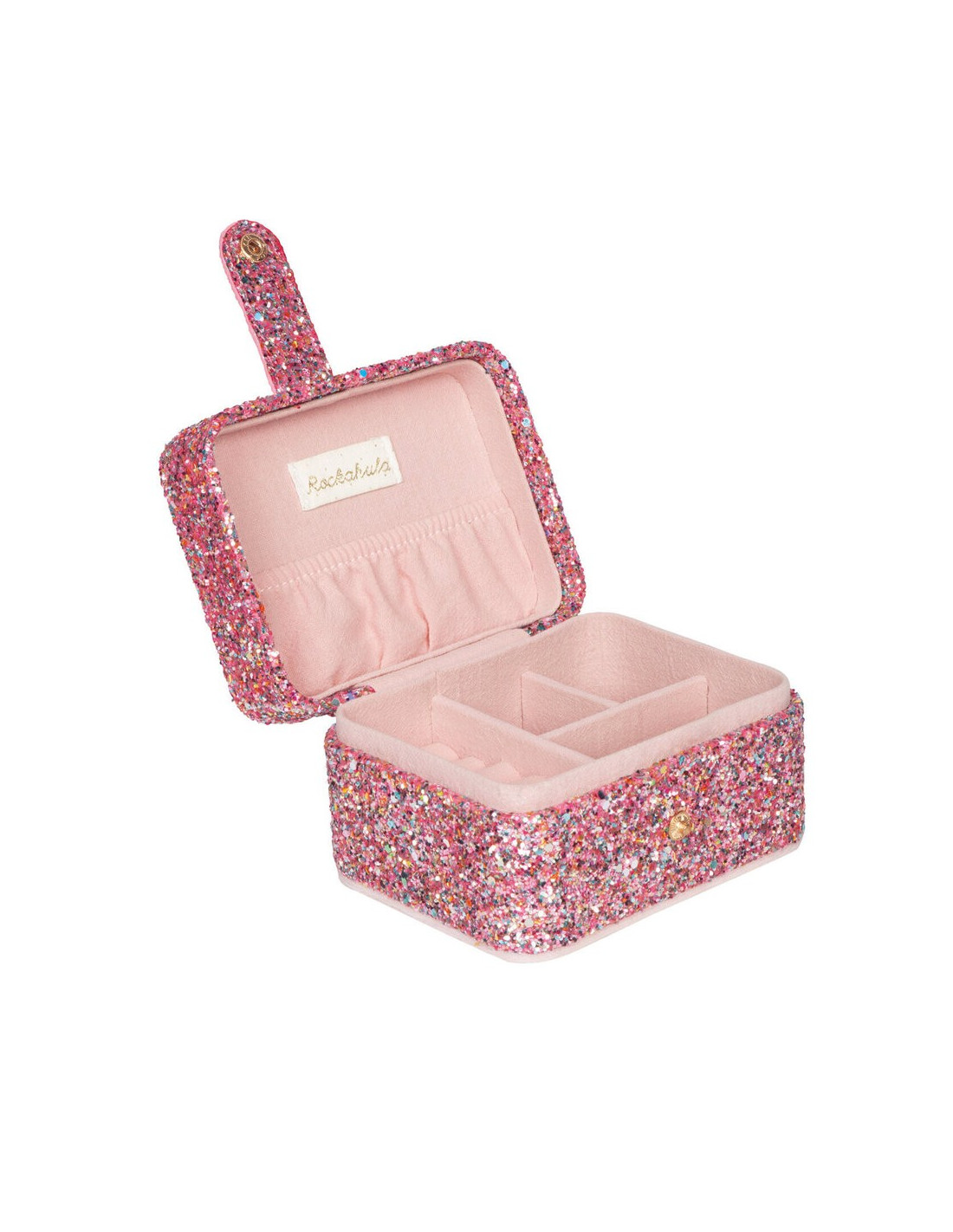 Cubierto con brillantina brillante multicolor y rosa, este joyero tiene un cierre de botón automático para revelar cuatro compartimentos, un bolsillo abierto y un espacio dedicado para colocar aretes y anillos.