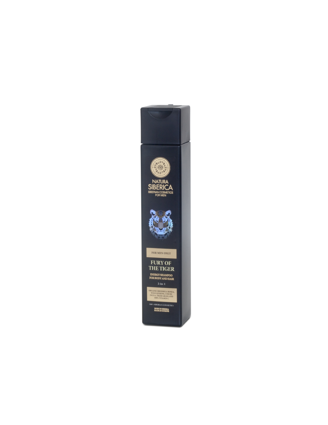 El champú energizante para cuerpo y cabello "La furia del Tigre" está hecho para hombres fuertes, valientes y seguros de si mismos. La Rhodiola Rosea orgánica es una poderosa fuente natural de energía. Proporciona vitalidad a tu piel y cabello, liberándolo del cansancio y estrés emocional a la vez que aumenta su eficiencia. El Ginseng Silvestre proporciona un potente efecto tonificante, promueve la nutrición del cabello y estimula su sano crecimiento. El Helenio de Ussuri controla la actividad sebácea y ayuda a sentirse fresco y alegre durante todo el día. La Hierba del Tigre tonifica y reafirma la piel. La Vitamina C 100% proporciona energía, vigoriza y protege la piel contra el impacto ambiental.