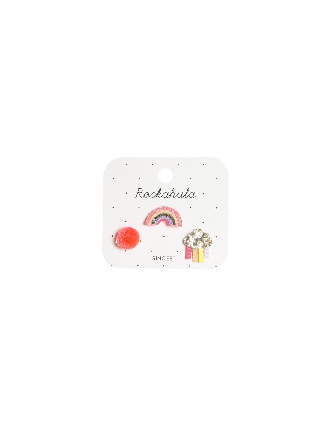 Un conjunto brillante y hermoso de tres anillos, con un arco iris, un pompón de neón y una brillante nube de lluvia. Cada anillo es ajustable para dedos pequeños.