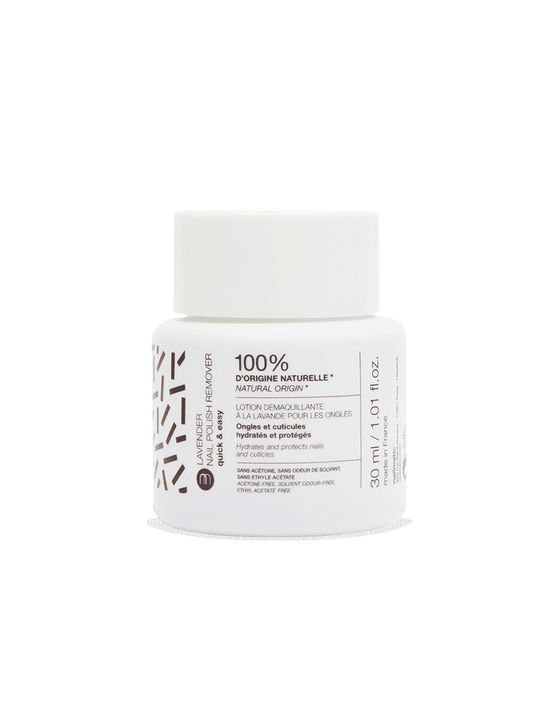 Quitaesmalte con 100% origen natural: aceite esencial de lavanda, aceite de almendras dulces y solventes a base de trigo, maíz y caña de azúcar.