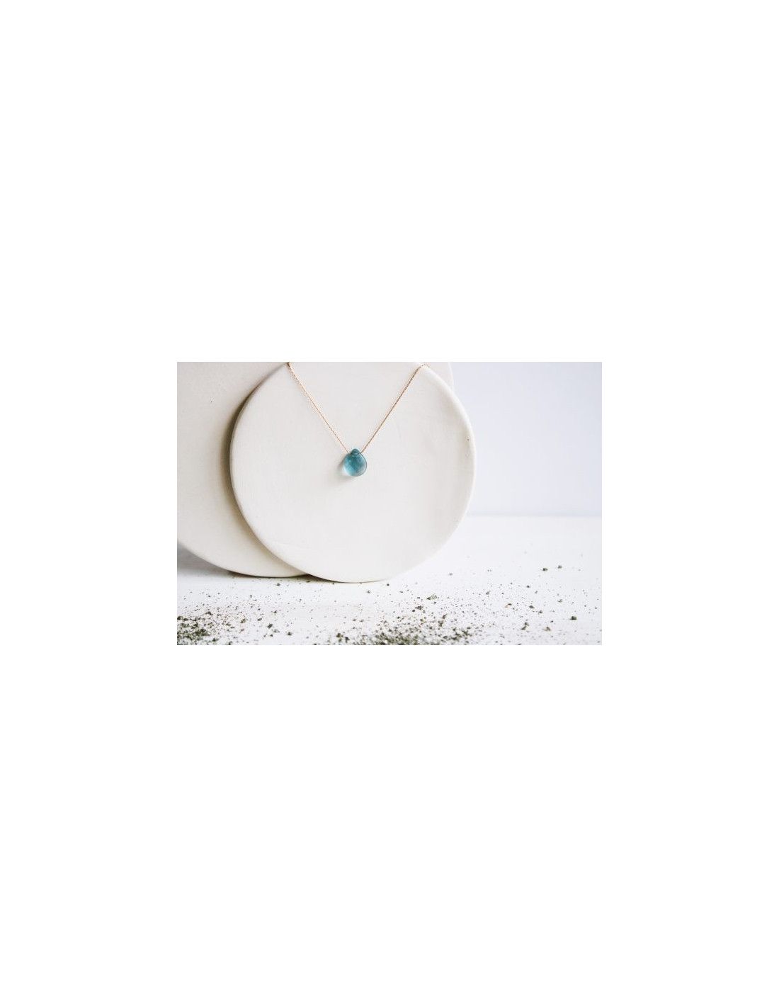 Rocío es una pieza sencilla y delicada con una bonita gota facetada de Fluorita natural de tonos verde turquesa montada sobre una cadenita dorada muy fina.