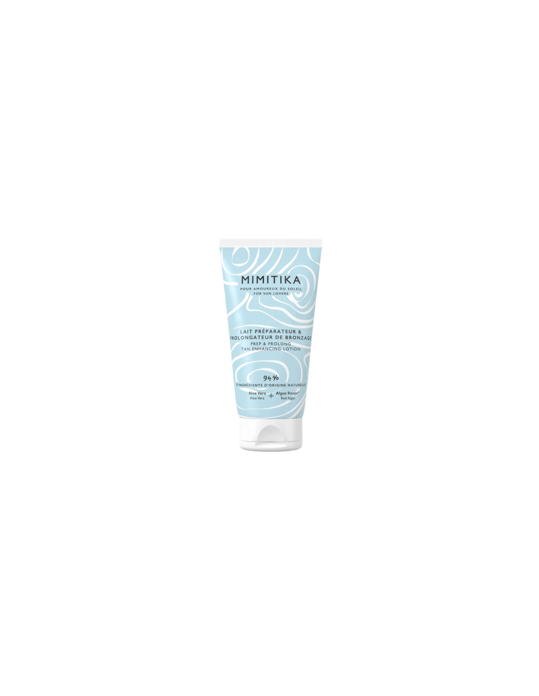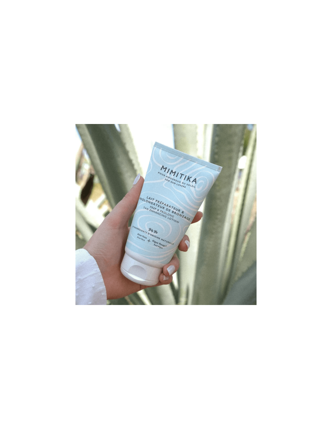 Prep & Prolong Tan Enhancing Lotion de Mimitika es una loción calmante e hidratante para el cuerpo que maximiza y prolonga el bronceado. La loción está formulada con poderosos antioxidantes e ingredientes nutritivos y calmantes como aloe vera, manteca de karité y extracto de sandía. Así, tras un día de sol, la loción hidrata y calma la piel a la vez que prolonga el bronceado. La loción se puede utilizar tanto como cuidado para después del sol para calmar, reparar e hidratar la piel después de un día bajo el sol, como para prolongar el bronceado después de unas vacaciones. La loción contiene más del 94 % de ingredientes de origen natural y su textura fresca se desliza fácilmente sobre la piel y se seca rápidamente, dejando la piel con una sensación suave.